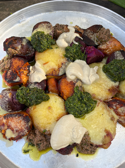 מגוון מנות על בסיס ירקות עונתיים, צמחים מהיער, ארוחה טבעונית.